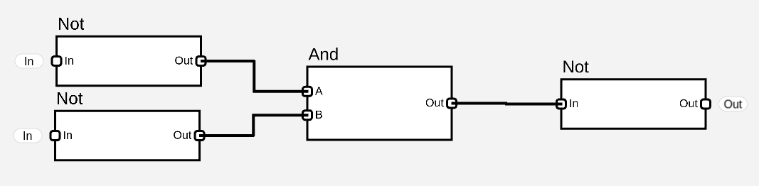 実は、Not回路とAnd回路、あるいはNot回路とOr回路のみで、あらゆる組み合わせ回路(入力信号のみで出力が決定できる回路)を作ることが出来ます。実際に、Not回路とAnd回路を用いてOr回路を作ってみましょう。