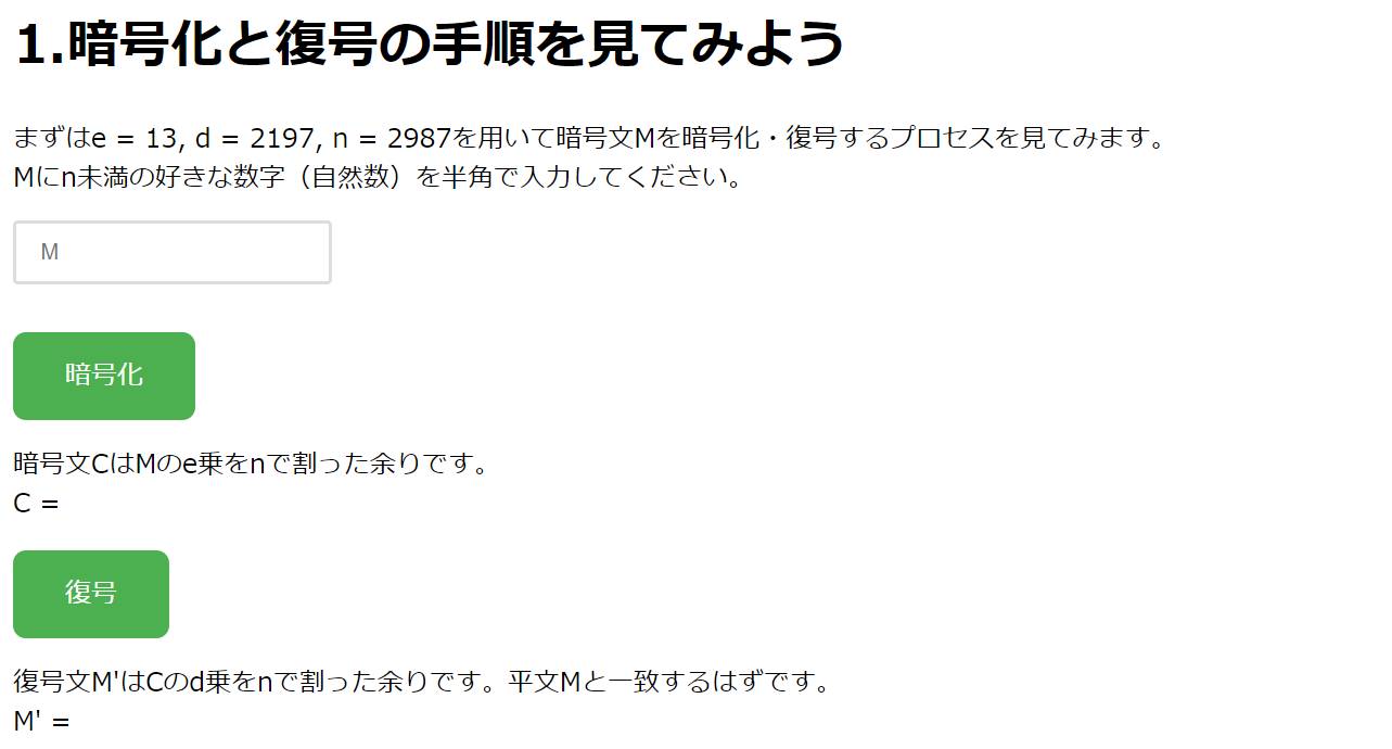 まずは指示に従って、 に 未満の好きな数を入れましょう。その後、「暗号化」のボタンをクリックすると、 に の 乗を で割った余りが表示されます。続いて、「復号」のボタンをクリックすると、 に の 乗を で割った余りが表示されます。