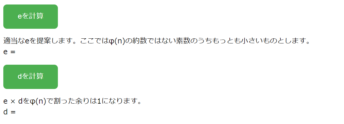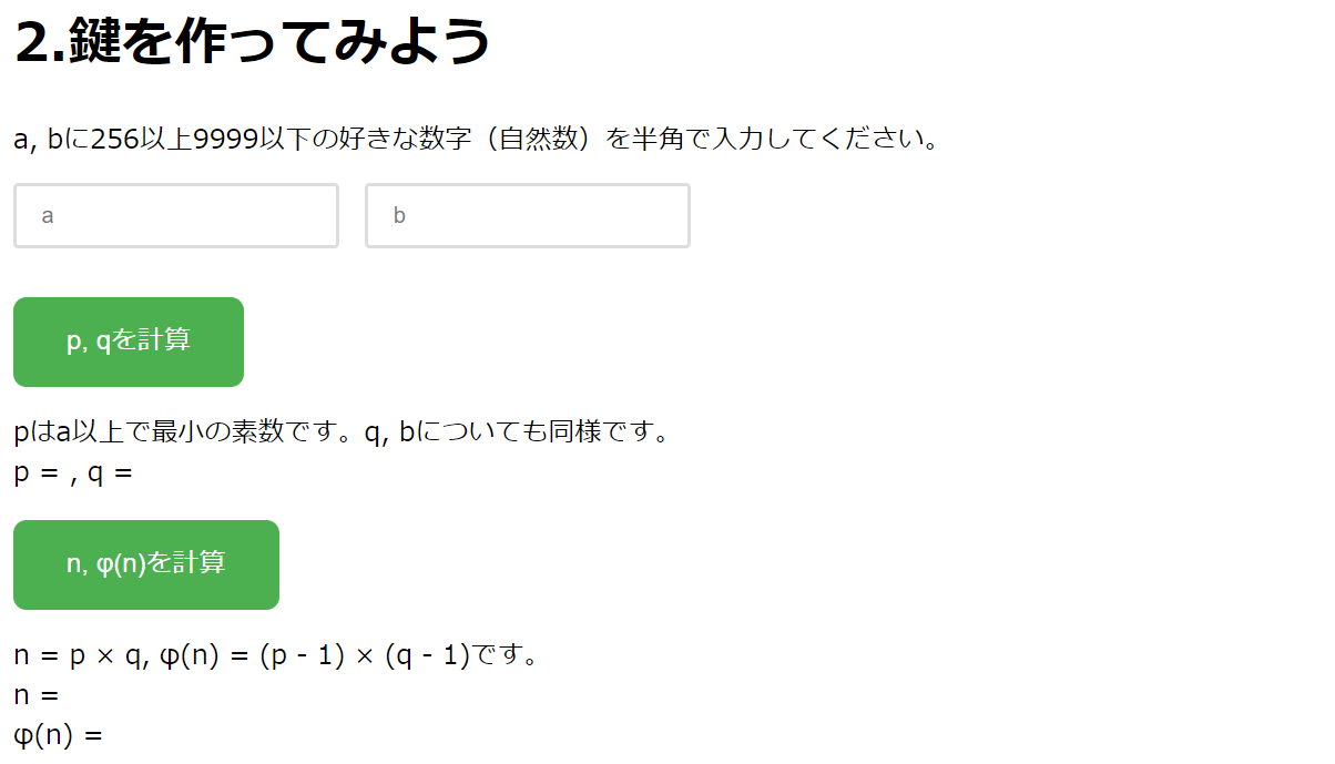 先ほどはRSA暗号の鍵が与えられていましたが、ここでは鍵を作ってみましょう。 と に、256~9999の好きな数を入力し、「 を計算」のボタンをクリックしてください。すると、 と が表示されます。 このとき表示される は 以上の素数のうち最小のものです。同様に、 は 以上の素数のうち最小のものです。ただし、 と は同じ数になってしまった場合は、自動的に再計算されて異なる数になります。なお、 と が文字コードの値よりも大きくなるようにするために、 と は256以上の数に限定しています。 続いて、「 を計算」 のボタンをクリックすると、先ほどの と から と が計算されます。